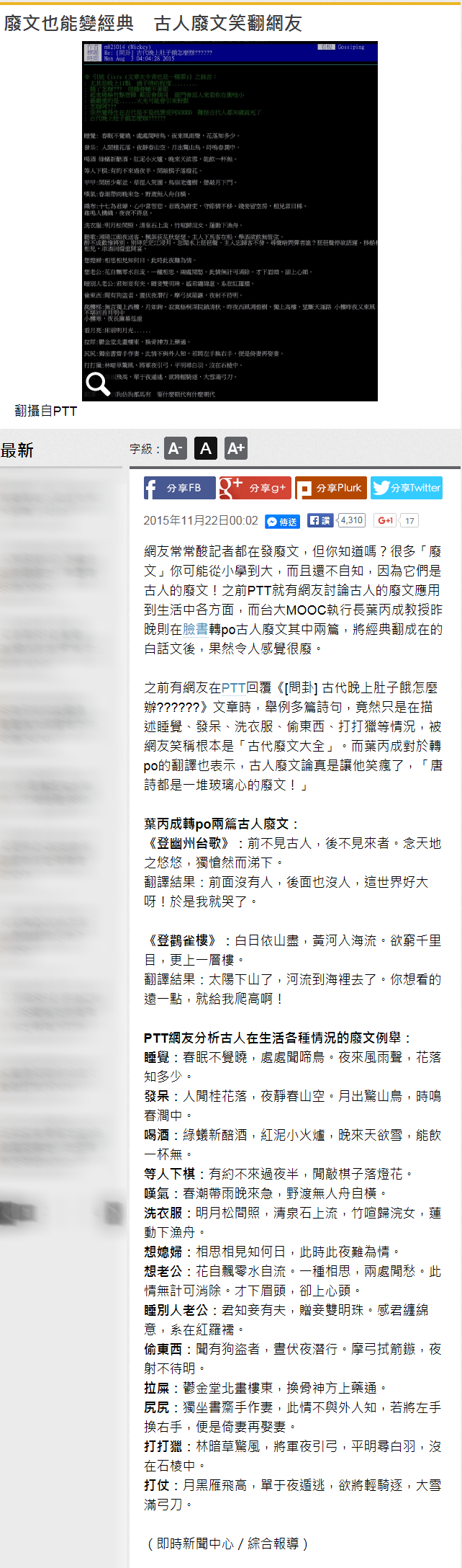 前幾天台灣的一則新聞:廢文也能變經典 古人廢文笑翻網友。