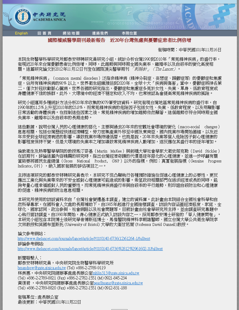 2010年常見精神疾病占了23.8%,危險因子包括女性、失業、低教育程度、以及明顯影響日常活動的身體疾病。